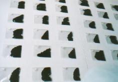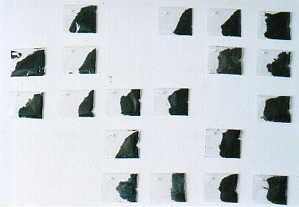 コーヒーは、生活の中にある種独特のかたちで入り込んでいる。それは飲み物であり、香りであり、色であり、何かわくわくするような不思議なものであると同時に、クールな静けさをともなっている。 コーヒーをいれる作業は儀式に似ている。コーヒー豆に対する儀礼的なしぐさ。そしてそれは私が何かをつくる時間、あるいは私という時間と深くかかわっている。それは「これ」と提示することができないので、私はかわりにそれらの豆を示そうと思う。 上は5月における私の時間を表わしている。つまり、03年の5月に私がいれたコーヒーである。毎日乾かしては袋に入れ、それをまた箱に入れ、それがひと月分たまり、白い石膏塗りしたパネルの上に並べてみると、しかしどんな物語も必要ないほどにそれは美しく見える。いや、どうだろう。