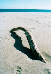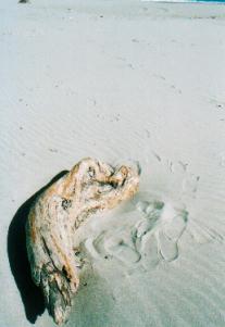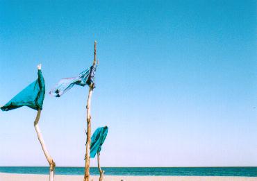 | 流木はどれも美しく、見ればすべてもうひとつつくりたい気持ちになる。あまりに大きなものはもって帰ってつくるわけにはいかないので、寸法をはかってアトリエでつくることになるのだろうか、などと思いながら細い流木を拾い、青や緑の布をつけて左のような旗をつくる。これはアフガニスタンでは殉教者の墓を意味するそうだ。私にはただの旗にしか見えないが、アフガン人が見れば、この下には死体が埋まっていると思う、そういった文化的な差異について、とても興味がある。たとえばそれは倫理的なものについてもそうなわけで、ただ単に生活習慣がちがうとかいったものとは思えない。それはいわば「世界」がちがうのだから。 |