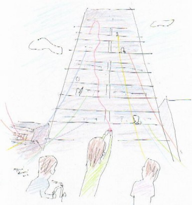 私はここから、私がこれまで取り組んで来た毛糸の作品に、みんなでつくった船を通すことで、船を船橋の空に浮かべることを思いつきました。船はまだここにはないものを運んでやって来る「未来」の象徴です。みんなでつくる船には、視覚的なデザインだけでなく、それが乗せてやがて帰港すべき「ゆめ」や「願い」などが書き込まれるにちがいありません。