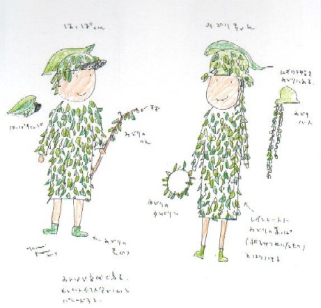 | 3.はっぱくん、みどりちゃん レインコートにワークショップ等でつくった葉っぱを無数にはりつけ、葉っぱのコスチュームをつくり、きらゆめ当日にこれを着て練り歩く「はっぱくん、みどりちゃん」を募集(複数でもよい)。 |