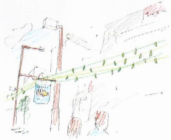 | ●NTTでのインスタレーション 商店街の街灯や店先など、散発的な展示というイメージがあるので、NTT中庭で集中力のある展示を行う。 剥き出しになった鉄骨部分にロープを十字にわたし、これにさらにロープをつるし、緑の風船をつけることでつる状の植物をイメージしたガーデン風の空間を出現させる。当日はこの下にカフェがオープンするということなので、コーヒー片手に空を見上げる絶好のロケーションである。 |