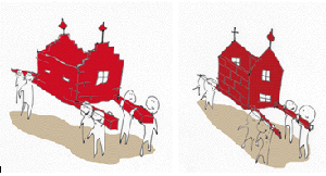 赤いプラスティックダンボール製の「レンガ」を積み上げて、「おみこし」や「お城」をつくります!