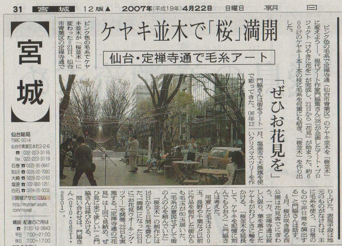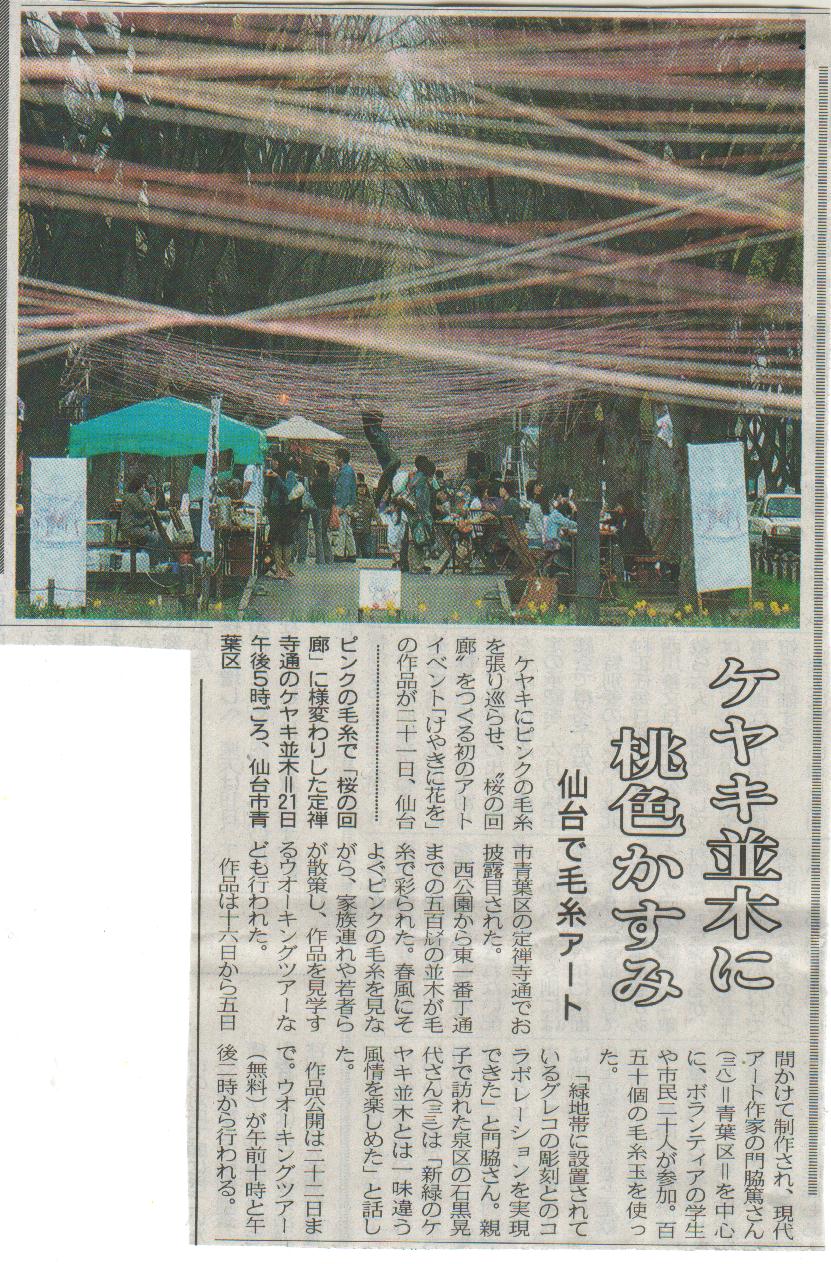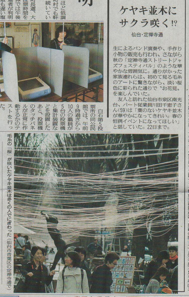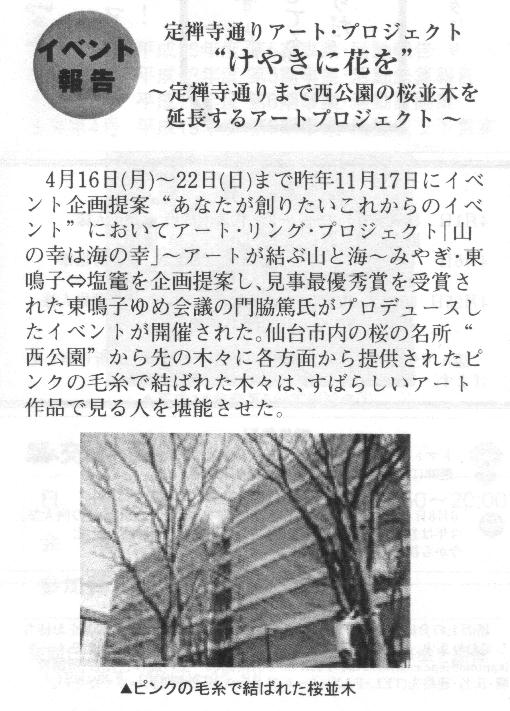 仙台・定禅寺通りアート・プロジェクト 「けやきに花を」 《パブリシティ》 ・「S-Style」 2007年4月号 ・ケーブルテレビキャベツ 「スキだっちゃ!」 2007年4月5日 ・「machinavi PRESS」 4月号 ・河北新報 2007年4月7日夕刊「ケヤキ並木にアートの花」 ・「仙台経済新聞」ヘッドラインニュース 2007年4月10日 ・読売新聞 2007年4月12日朝刊 ・ラジオ3 「トワイライト・ウェーブ」 2007年4月12日 ・「リビング仙台」 2007年4月14日 ・NHK仙台放送局ラジオ第一「よじらじ!宮城」 2007年4月16日 ・TBC東北放送 「イブニングニュースTBC」2007年4月16日 ・KHB東日本放送 「スーパーJチャンネルみやぎ」2007年4月16日 ・仙台放送 「スーパーニュース」2007年4月16日 ・ミヤギテレビ 「OH! バンデス」2007年4月16日 ・TBCラジオ「YAGIYAMA発!ラジオな気分」 2007年4月18日 ・KHB東日本放送 「スーパーJチャンネルみやぎ」2007年4月20日 ・仙台放送 「スーパーニュース」2007年4月20日 ・日本イベントプロデュース協会「Jepc NEWS」vol.36「報告」 |