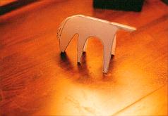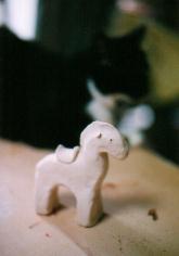奥の黒いのはうちの猫(ごる) 8/20 wed 馬の、たてにうすい感じがやっと出てくる。そういえば馬というのは、こんな感じのものだった。絵を描くときには、ものを見て、それをうつしとるようにしてしか絶対に描けないように思うのに、馬を作っている今は、馬など一度も見ずに作っている。