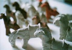 8/12 tue 中本誠司記念アート週間公募展で、これに賞をくださったGROUNDさんから、「かくれんぼアート」に参加するよう声をかけていただく。企画をお送りし、夜、現地を見ながら打ち合わせをする。 8/13 wed ふと車を走らせていて、あまり行かない仙台市博物館に入ってしまう。おそらくは以前にも見ているはずの縄文人がつくった器や埴輪の、あまりのみごとさに驚嘆しつつ、この雰囲気で「馬」をつくろうと思う。それは以前、レンガを作ったときに感じたような、焼き物のもつ質感への驚きとか、感動のつづきで、私はそれを紙ねんどにテンペラを塗ることで表現し、やがてそれがレンガにとどまらず、やがて「枕木」やら「石」やらも同じようにしてつくるようになったのだが(そしてそれからこの作業は頓挫しているのだが)、今回ははにわ風の馬として、それを続行してみたいと思う。 2003/8/14 thu 伝馬制。