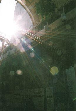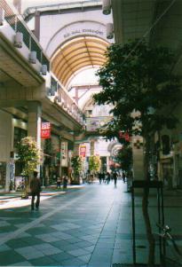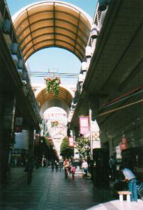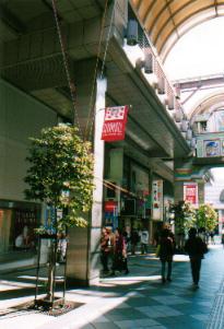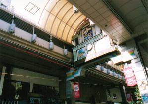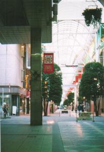展示1日目は快晴。サンモール一番町商店街が誇る開閉式のアーケードが、秋の光を存分に導きいれる。光の中に浮かび上がる毛糸のラインが美しい。
