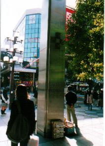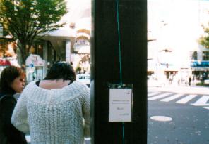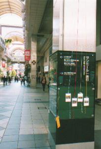 あちらこちらにそう書かれたカードがはりつけられている。その出発点はここ。仙台の中心部にあるいくつかのアーケード街が、大きくTの字に分かれる地点。4色の毛糸が柱の上へとのぼっていく。