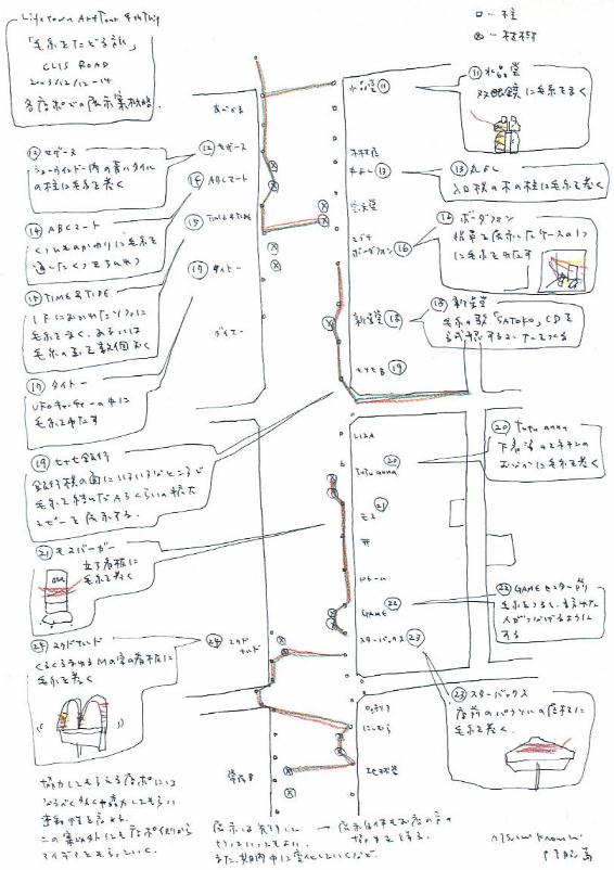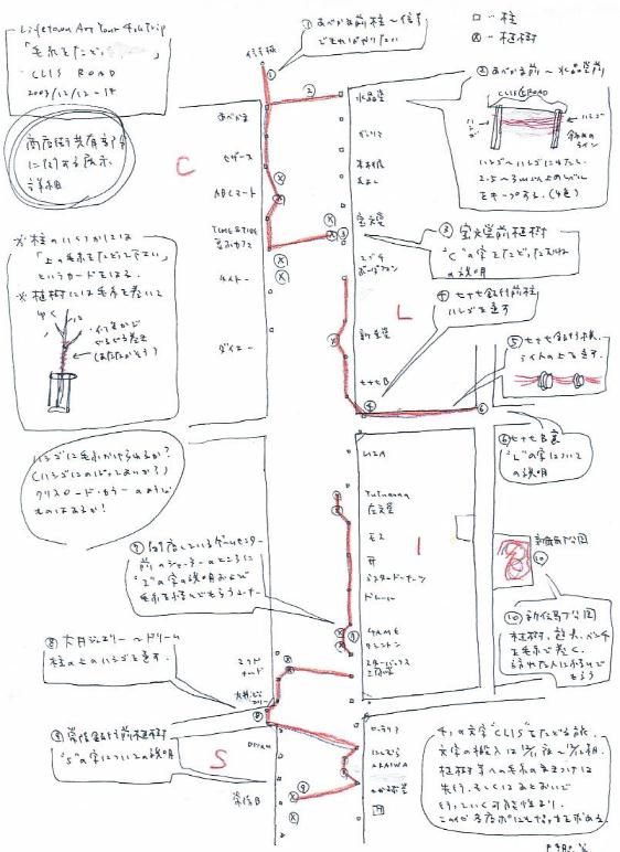 T商店街共有部分での展示 アーケードにめぐらされた毛糸。アーケードの柱には「毛糸をたどってください」というカードがあちこちにはられている。毛糸をたどると、それが上から見ると文字になっていたことが明らかになる。全部で4つ、CLISという文字。また、それらをたどりながら、さまざまなものが毛糸で巻かれているのを目にする。 展示プラン詳細