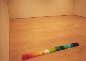 私はここで二本の虹、すなわち通常見える虹である主虹と、運よくその上に見えることのあるすこしうすい副虹を表現した。左の写真にもあるように(毛糸が全然見えないが)、私は赤を一番下に、それから順に波長の長い順に色を結んでいった。これは外延が赤である副虹の形態を表わしている。一方、結んだ毛糸の数である41は主虹を表わしている。主虹の赤い部分が見える角度(虹角)は約42°で、これはデカルト以前から一部で知られていた。そこから1を引いているのは、最後の1本を、見る人がどこに何色を通すかを考えるために残したわけである(他に、赤の虹角が42°である一方、もう片方の端である紫の虹角が40°のため、その間をとった41という数字と考えてもよい)。
