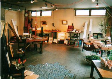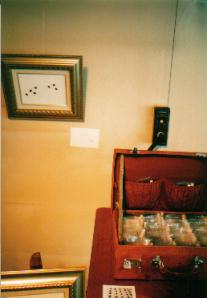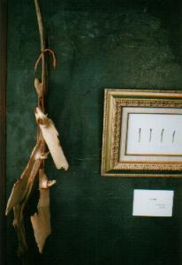 右は、今回はじめてお見せする「Dating」(かばんにつめられた乾燥させたコーヒーのだしがらの入ったビニール袋)。後ろの壁には紙ねんどとテンペラでつくったコーヒー豆の「絵」。
