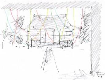 | 2.境内のほかの場所にも毛糸を結ぶ 三門から毛糸を結ぶほかにも、本堂裏手の池泉式庭園の池の上や、裏の林、参道入口、松川などで、毛糸のインスタレーションを展開できるところがあれば、展示したい。 また、 夜、境内にあかりをつける展示を行う。大型の紙コップをふたつつないだものの中に、懐中電灯を入れ、簡易的な「あかり」として境内を飾る。電池なので電源も要らず、火の心配もなく、安価なものなのでなくなっても困らない(以前行ったあかりのようすはこことここ)。 |