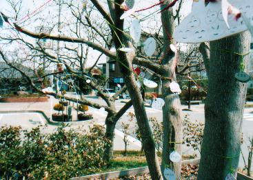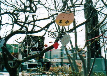 まずはこの駅前ロータリーに、小布施と仙台の子どもたちがつくった「くりんこくん」を設置する。日ざしはあたたかなのだが、けっこう風があって、くりんこくんたちがいっせいにゆれる。厚紙がたがいに、そして木にぶつかってたてるかすかな音が心地よい。