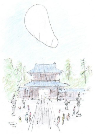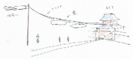 風船もしくは新聞紙を入れた3〜4メートル程度のビニール製の雲型オブジェを1〜2個制作、玄照寺三門手すり部分(何らかの方法で支持部分は強化する)と境内内のポールとの間をロープで結び、このロープに「雲」をつるす。
