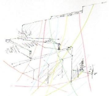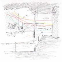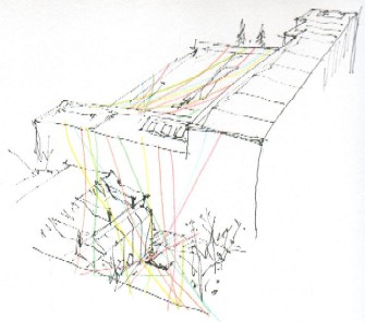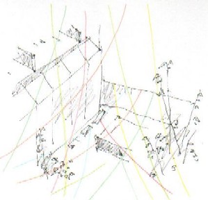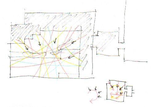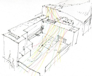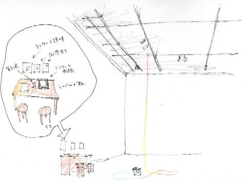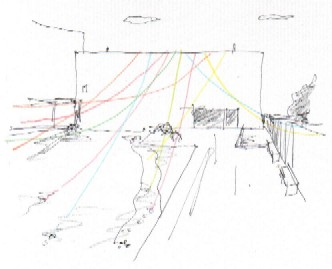 作品の展開 南東〜北西に結んだ毛糸を軸に、やがて時計回りに、らせん状に東山館屋上から毛糸をふやしていく、など。 |