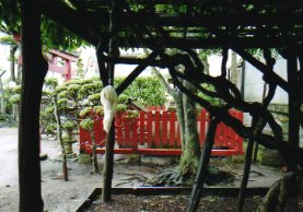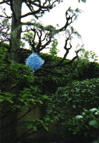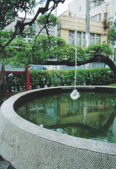 仙台在住のアーティスト・越後しの氏の「ゆきを」というタイトルがつけられた一連のシリーズです。 このシリーズは数年前から継続的に取り組んでいるもので、テグスを無数に結んでできた結晶のような線状の部分と、これにつるされる部分からなっていて、つるされるものは主に動物の毛からなっています。これまでにうさぎや羊、ラッコなどさまざまなものが制作されています。 が、神社の入り口にあるこの池に設置されているのは珍しくガラスです。梅雨時の池にとても似つかわしい作品です。