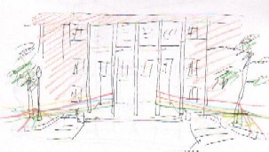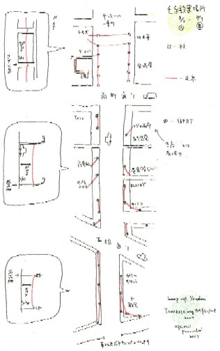 北門守衛室〜旧標本館まで:基本的に松の木に毛糸を結んでいく 旧標本館は昭和2年築の近代建築であり、昨年から「再生」工事が行われ、「再生展」にとっては象徴的な場所であると言える。裏手には魯迅の学んだ「階段教室」もあり、そちらも結びたい。 |