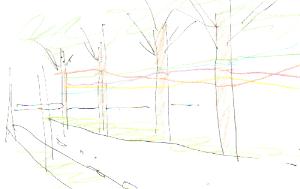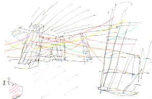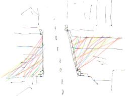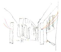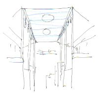 @多元研科学計測研究棟から、中庭に無数の毛糸を結ぶ。 多元研科学計測研究棟と工場棟に囲まれた静かな中庭に、無数の毛糸を結んでみたいと思います。3階建ての研究棟から緑あふれる中庭に惹かれた無数の毛糸は、ときおり風にたなびき、とても不思議な風景が現出することでしょう。また、訪れた人が毛糸を結べる、あるいは願い事を書ける、というのも用意したいと思います。