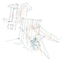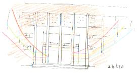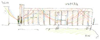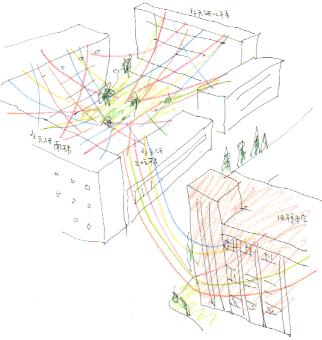 旧標本館から多元研中庭へと毛糸をつなぐ(高さの確保)。多元研研究棟、工場棟より中庭に向けてなるべくたくさんの毛糸を結ぶ。会期中に訪れた人にも手伝ってもらい、増やしていくなどしたい。