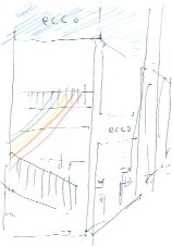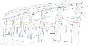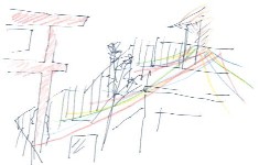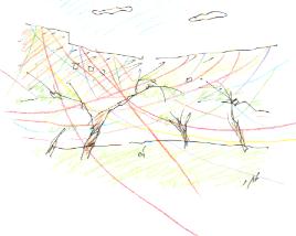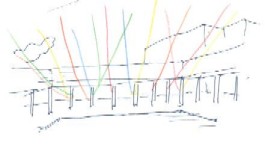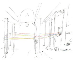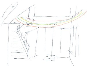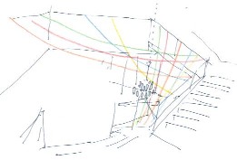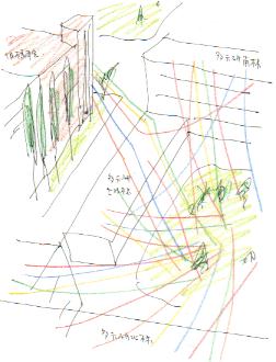 ↑サンモールから片平キャンパスにいたる並木への毛糸設置イメージ。 南町通り〜五橋通りまではすべてをつなぐということにはこだわらず、あちらこちらで数本に毛糸が結ばれている、という感じで。五橋通りから片平キャンパスまではひとつにつなぐ。 「たどってください」といったカードをあちらこちらにはり、片平キャンパス方面へと導く。 |