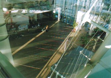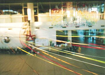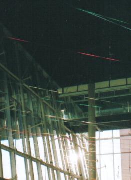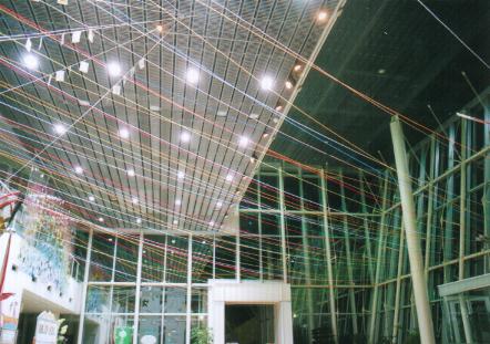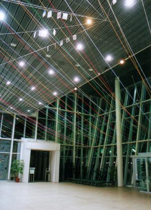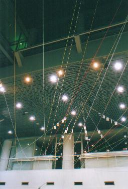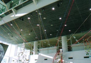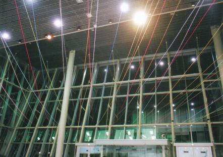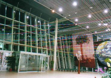この現代の箱舟たる「ワンダー・シップ」のエントランス・ホールを飾る毛糸は、人類が神あるいは自然とうまく折り合いをつけてやっていく、その証であり象徴でもある虹を意味する一方、人類が手にしてきた恩寵たるエネルギーその他の資源を表わしています。すなわち、光、ガスを含む熱、風、水をそれぞれ黄色、赤、白、青の毛糸が表わし、電気や森、山、大地をオレンジや緑、紫、茶が表わす、といったぐあいに。学問的な区分けでは、同じレベルのものとしては扱われないだろうものも、アートのもつメタファー(隠喩)の力=エネルギーをかりることで、同じひとつの物語に登場する登場人物のように並べて提示できるのではと思い、制作いたしました。