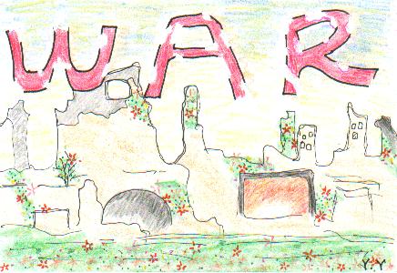 中学3年生のゆみさんは、廃墟に草花が広がり、WARの字が消えていくというようすを、感動的かつ知的にえがききっています。