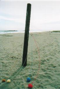 秋晴れのお昼どき。夏には海水浴客でにぎわうだろうこの場所も、こんな季節の平日とあって、数人のサーファーをのぞいては誰もいない。なぜか砂浜に点々と立つ電柱に、私は毛糸を結びはじめる。思えばここは、こどもの頃、海水浴に来た場所だったと、ほのかな記憶がよみがえる。