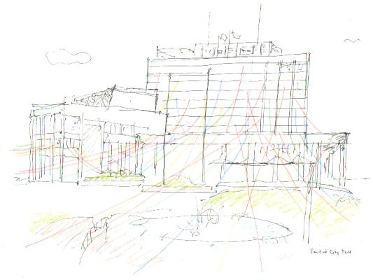 仙台市役所庁舎と市議会場に毛糸を結ぶ。