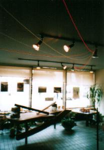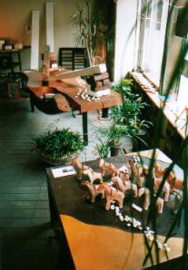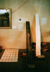 右は、今回はじめてお見せする「Dating」(かばんにつめられた乾燥させたコーヒーのだしがらの入ったビニール袋)。後ろの壁には紙ねんどとテンペラでつくったコーヒー豆の「絵」。