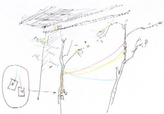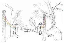 | 2.境内のほかの場所にも毛糸を結ぶ 三門から毛糸を結ぶほかにも、本堂裏手の池泉式庭園の池の上や、裏の林、参道入口、松川などで、毛糸のインスタレーションを展開できるところがあれば、展示したい。 また、 夜、境内にあかりをつける展示を行う。大型の紙コップをふたつつないだものの中に、懐中電灯を入れ、簡易的な「あかり」として境内を飾る。電池なので電源も要らず、火の心配もなく、安価なものなのでなくなっても困らない(以前行ったあかりのようすはこことここ)。 |
