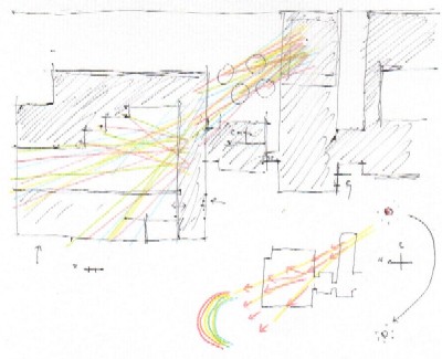作品の展開 南東〜北西に結んだ毛糸を軸に、やがて時計回りに、らせん状に東山館屋上から毛糸をふやしていく、など。 |