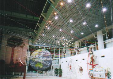 この現代の箱舟たる「ワンダー・シップ」のエントランス・ホールを飾る毛糸は、人類が神あるいは自然とうまく折り合いをつけてやっていく、その証であり象徴でもある虹を意味する一方、人類が手にしてきた恩寵たるエネルギーその他の資源を表わしています。すなわち、光、ガスを含む熱、風、水をそれぞれ黄色、赤、白、青の毛糸が表わし、電気や森、山、大地をオレンジや緑、紫、茶が表わす、といったぐあいに。学問的な区分けでは、同じレベルのものとしては扱われないだろうものも、アートのもつメタファー(隠喩)の力=エネルギーをかりることで、同じひとつの物語に登場する登場人物のように並べて提示できるのではと思い、制作いたしました。