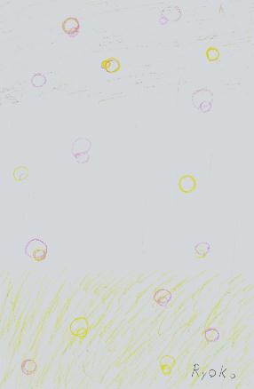 アフガニスタンの地図もかいてくれた小学6年生の涼子ちゃんは、草原に降りしきる雨をかいてくれました。雨つぶはきれいな色のシャボン玉のようです。